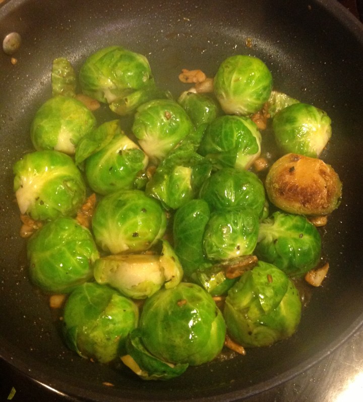 Add the butter to a saute pan and turn to a medium heat. (You may use some light cooking oil to supplement the butter) Saute the garlic for a few moments and then add the brussels sprouts, making sure to keep the exposed cut sides face down. Sprinkle a pinch of salt and crack some pepper over the pan, stirring occasionally until the sprouts have browned.