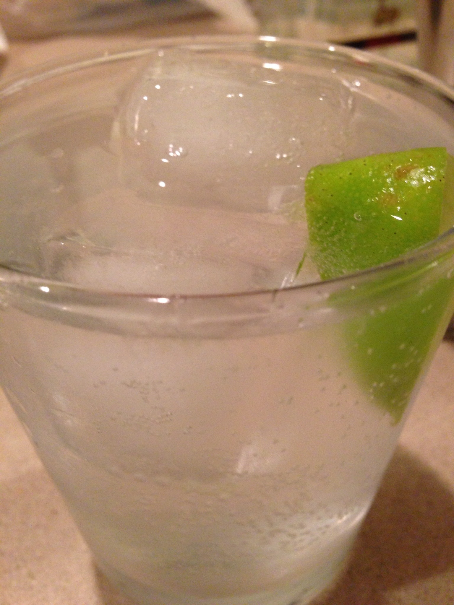 Now for the drink! Take a lime and cut it in half, in half again, and that half once more. Squeeze the juice from this little wedge into the bottom of your glass and add the wedge to the glass as well. Pour in two ounces of your favorite gin. All of this can be done before hand with no rush. Add two or so large ice cubes to the glass and pour tonic water to fill up to brim.