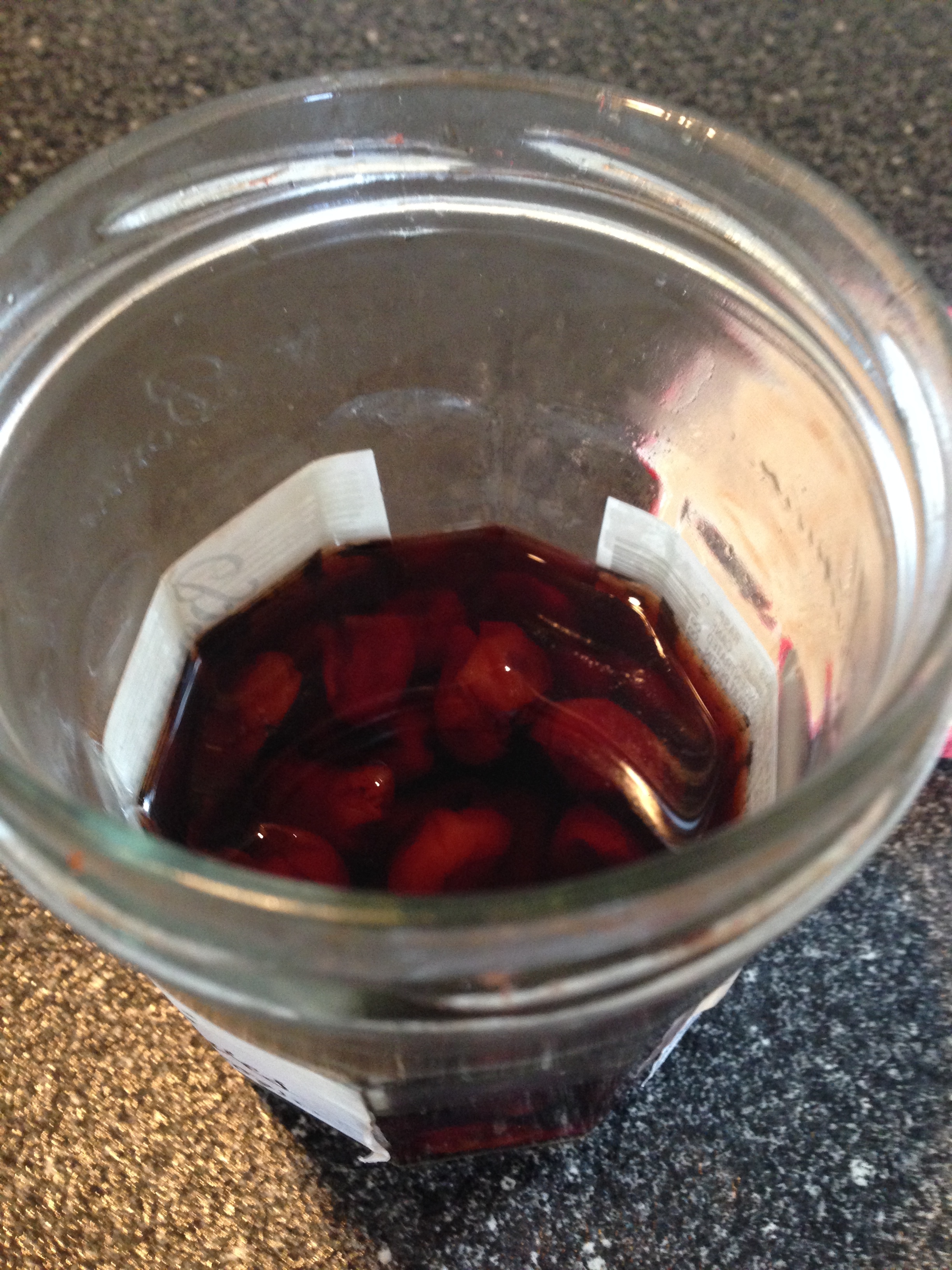 Trader Joe’s to the rescue! They have a bag of dried sour cherries (they called them “tart”) that was reasonable and since I hadn’t found any cherries elsewhere I was ready to start. Most recipes call for cognac, spices and sugar. We thought that the cherries were sour and didn’t need sugar to come out delicious. Spices also didn’t make sense (have you ever tasted spice in your cocktail cherries at a bar?).