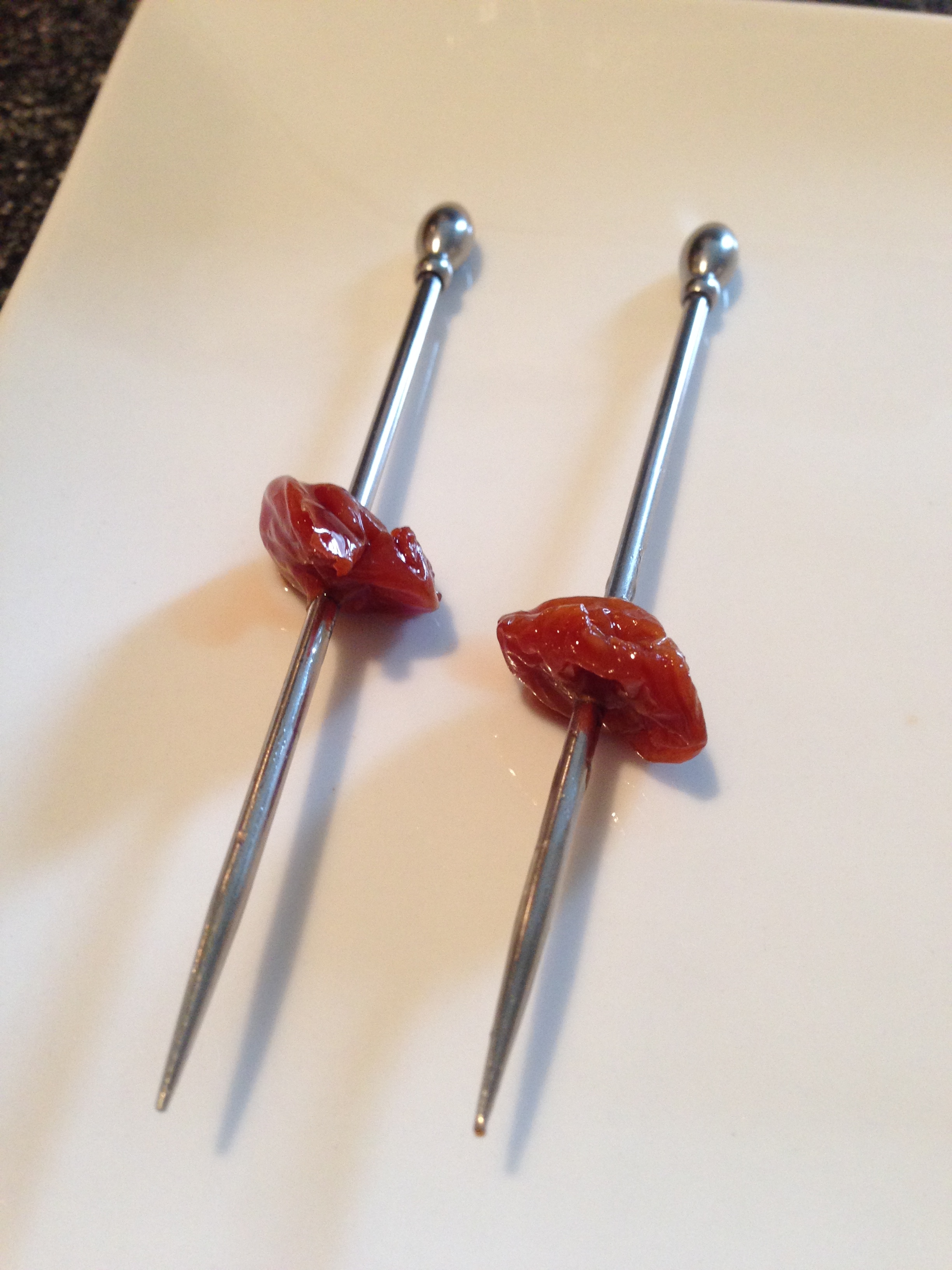 So we decided on a two ingredient recipe. Dried sour cherries and cognac. Only caveat, they take a long time to marinate. As in weeks. One week isn’t enough (oh we tasted!). Three weeks was enough for the cherries to really mellow out and get perfect for a Manhattan. This isn’t so bad at the end of the day (or weeks) because you can reuse the cognac from your first batch as you make more!